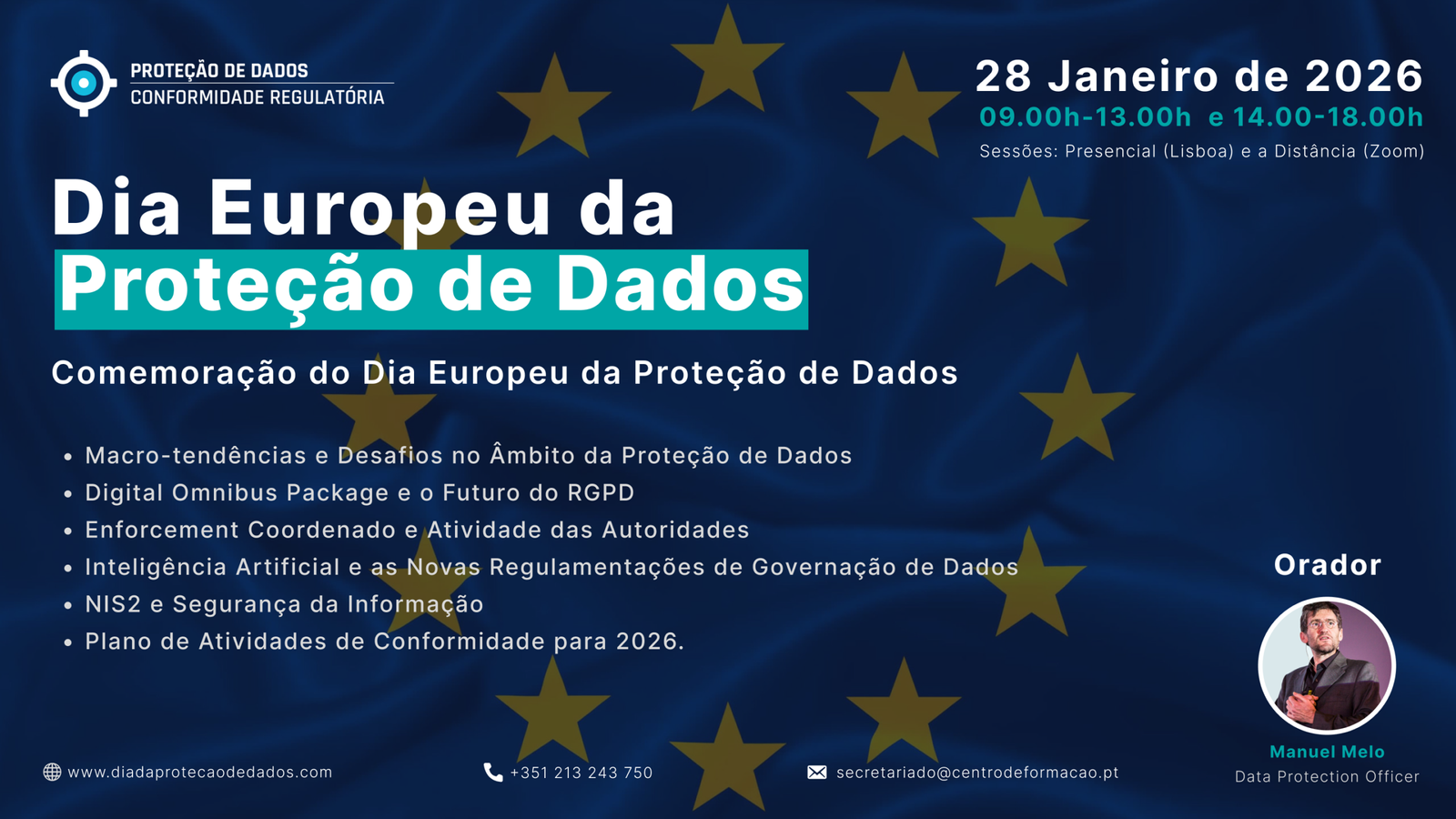 Apresentação do programa do evento do dia 29 de janeiro de 2026 – Dia do Encarregado da Proteção de Dados – e das sinergias temáticas entre os dois eventos, com informação sobre condições especiais de participação conjunta.